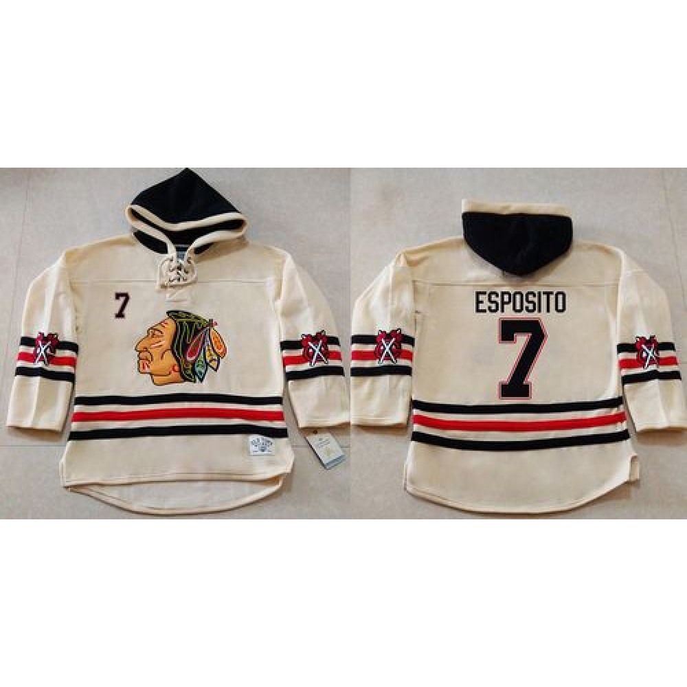 Blackhawks #7 Tony Esposito Cream Heavyweight Pullover Hoodie Stitched NHL Jersey