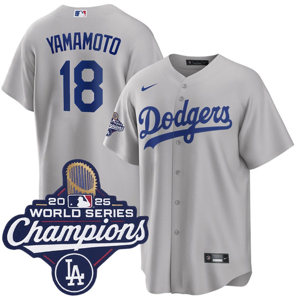 Men's Los Angeles Dodgers #18 Yoshinobu Yamamoto Nike Gray 2025 World Series Champions Home Replica Jersey