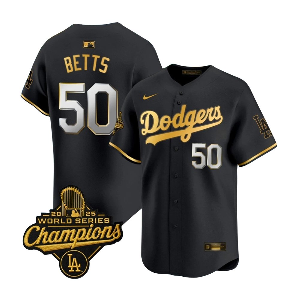 Youth Los Angeles Dodgers #50 Mookie Betts Nike Black Golden 2025 World Series Champions Home Limited Jersey