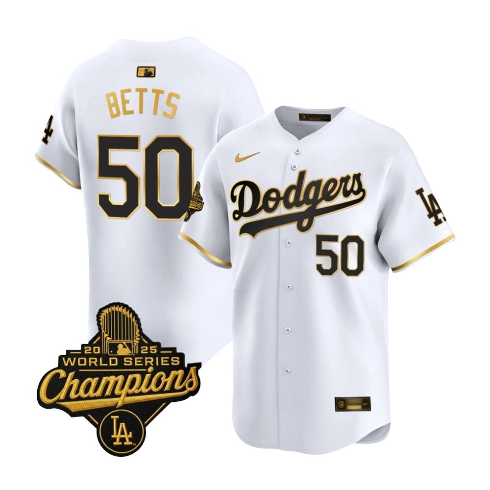 Youth Los Angeles Dodgers #50 Mookie Betts Nike White Golden 2025 World Series Champions Home Limited Jersey